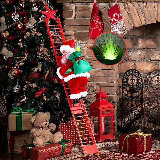 Muñeco de Santa Claus subiendo escalera eléctrica con luces