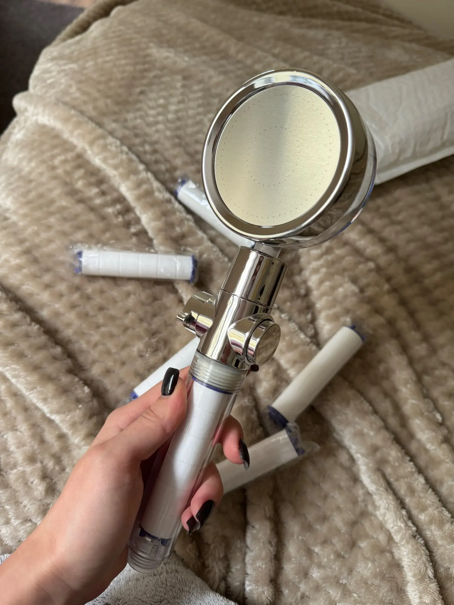 Nuestro cabezal de ducha filtrado con triple función de filtración mejorada. El filtro de algodón limpio puede eliminar eficazmente las impurezas en el agua, como la suciedad y los metales pesados, el cabezal de ducha turbo protege la salud y la seguridad de la piel de tu familia. 2 filtros de algodón adicionales están preparados para ti. Se recomienda